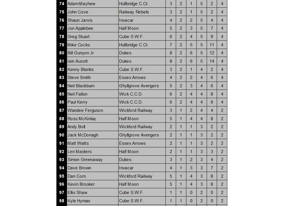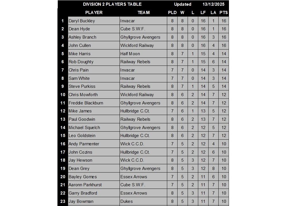 DIVISION 2 PLAYERS TABLE